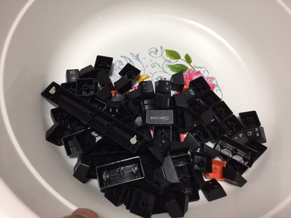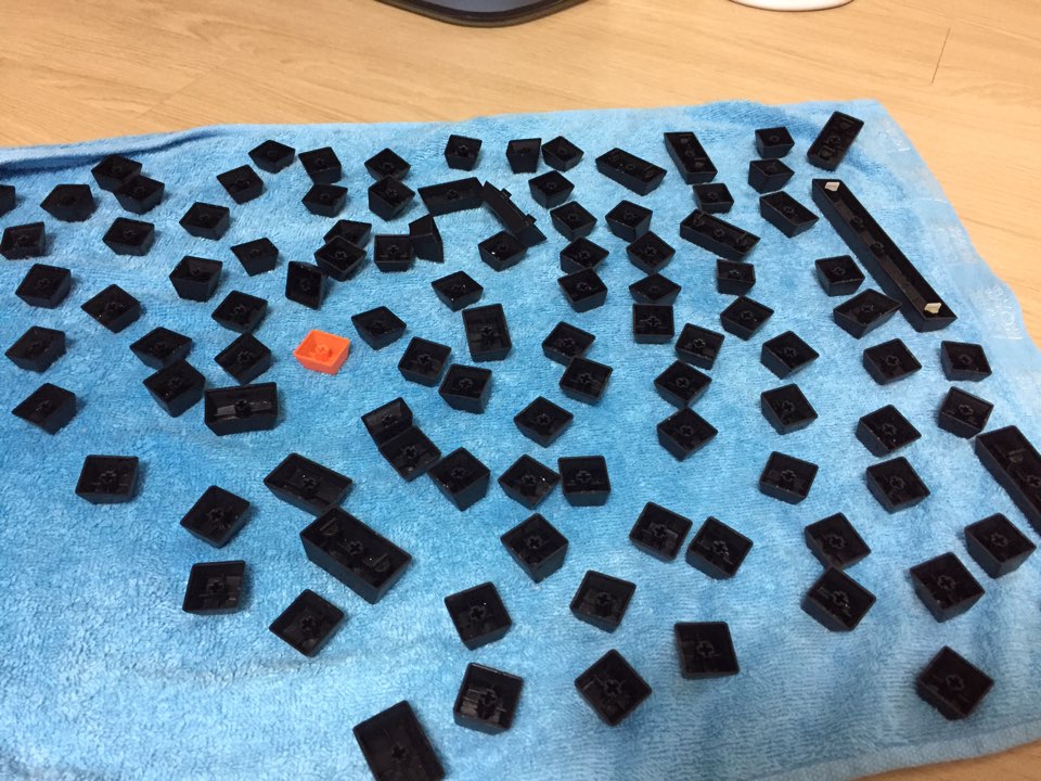 키를 윤활하기전 물에 담가놓은 키캡을 꺼내어서 수건위에서 건조시킴